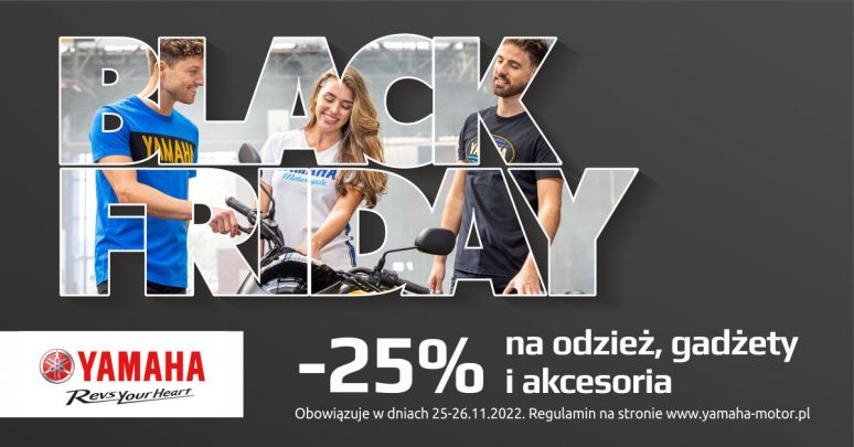 Promocja Black Friday obowiązuje tylko w autoryzowanych salonach Yamaha, w godzinach ich otwarcia, od 25 do 26 listopada 2022 roku. Black Friday obejmuje wyłącznie odzież, akcesoria i gadżety marki Yamaha i nie łączy się z innymi promocjami.